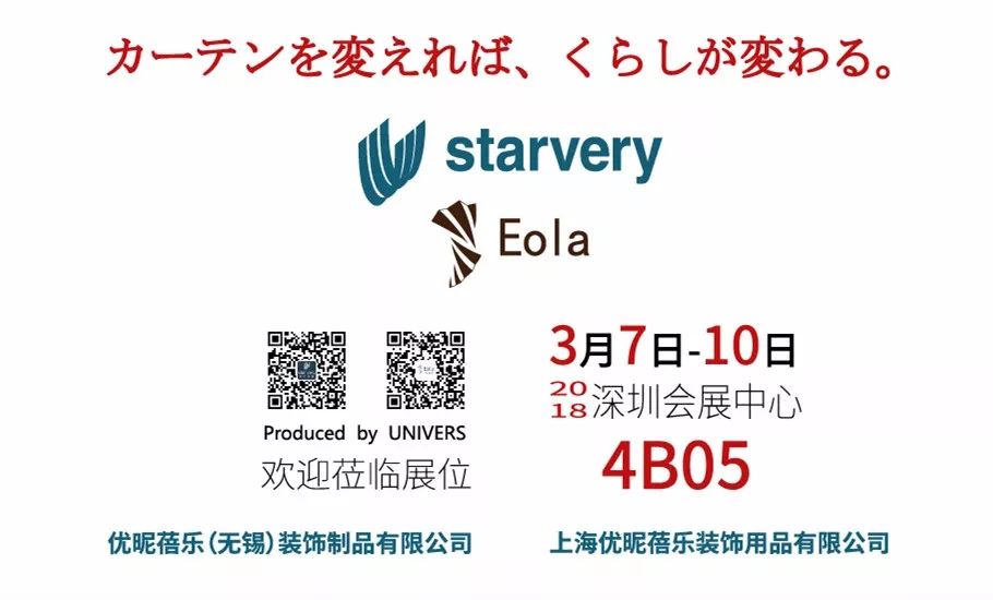 此次,优昵蓓乐(无锡)装饰制品有限公司和上海优昵蓓乐装饰用品有限公司将携starvery、Eola、mornin'等旗下众多品牌亮相深圳国际家纺展。更有我们的新品“wake curtain”蕾丝窗帘与大家首次见面。